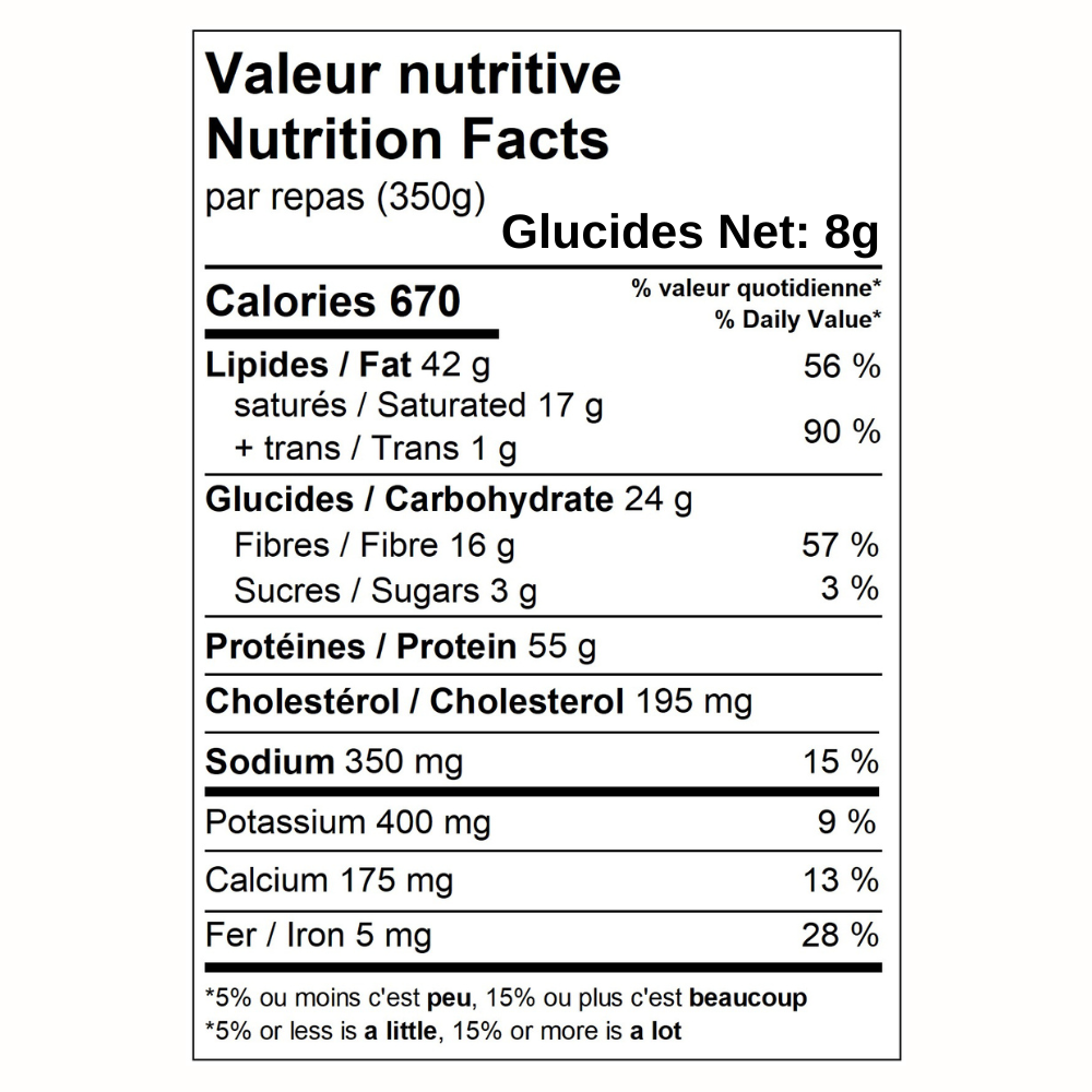 ingrédients: boeuf, champignon, brocoli, choux de bruxelles, crème, yogourt nature, eau, vin rouge, beurre, huile d’olive, oignons, moutarde , ail, fibre végétale prébiotique, isolat de protéine de pois, protéine de féverole, fibre végétale de blé, farine de lin, gluten de blé vital, farine de lupin, fibre de pomme de terre, gomme de cellulose, amidon de tapioca, lécithine de tournesol, sel poivre et epices.