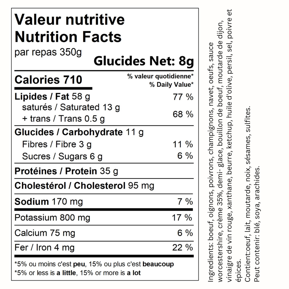 Boulette de boeuf garnie d’oignons caramélisés, poivrons rôties & champignons sautés. Le tout accompagné de frites de navet et sauce au poivre.